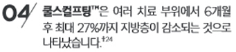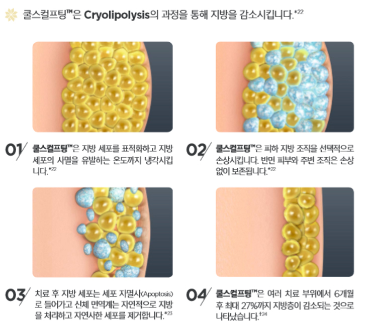 クールスカルプティングは非侵襲的な方法で皮下脂肪層を減らす施術です。制御された冷気を利用して運動だけでは落ちにくい皮下脂肪細胞を除去します。冷凍された脂肪細胞は時間が経つにつれて死滅し、体内で自然に代謝され除去されます。クールスカルプティング施術後6ヶ月以内に27%程度の脂肪を除去できます。