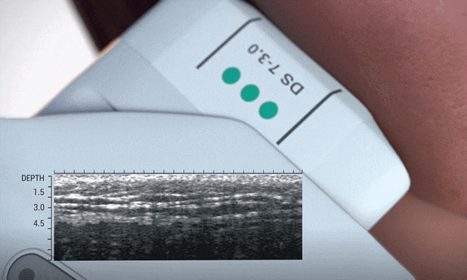 カスタムウルセラの施術時、部位別の皮膚厚を超音波で確認した後、施術の深さと方向、適切な強度と必要なショット数を綿密にチェックします。